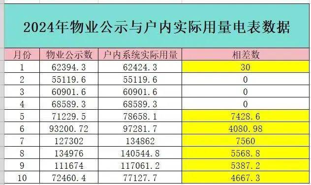 ▲业主整理的2024年1~10月物业公示与户内实际用电量数据。受访者供图