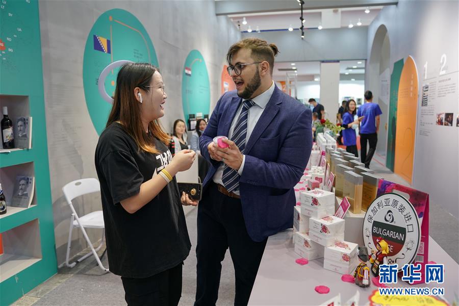 9月25日,来自索非亚中国文化中心主题馆的外语主持人高伟义(右)在向游客介绍中东欧特色产品。 2020海丝之路(中国·宁波)文化和旅游博览会于9月25日-27日在宁波国际会展中心举行,吸引了“一带一路”沿线多个国家和地区参展。 新华社记者 殷晓圣 摄