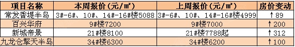 尽管本周总体跌势明显,但也有9盘出现上涨,其中4盘幅度较低,比较稳定,分别为常发香堤半岛论坛)3#-6#、10#、14-16#楼,百兴华府论坛)9#楼、新城帝景论坛)21#楼和九龙仓擎天半岛34#楼。从4盘涨幅来看,均在200上下,涨幅较为稳定,涨幅较大的为新城帝景,由原来的7788元/㎡起涨至8100元/㎡,单价涨了312。新城帝景21#楼为精装修,7字开头价格确实不高,目前248套房源120套已备案,去化近半成,如此走俏,房价稍涨也是情理之中。涨幅较低的是常发香堤半岛3#-6#、10#、14-16#楼,由原来的4999元/㎡涨到5088元/㎡,单价仅涨了89。据悉,目前常发香堤半岛均价为5200元/㎡,小高层都是5字开头,项目价格还是比较稳定的。