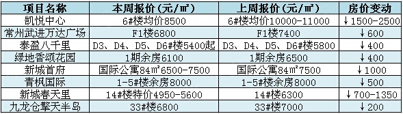 据悉,本周常州共有8盘下跌幅度较大,分别为凯悦中心论坛)6#楼、常州武进万达广场论坛)F1楼、泰盈八千里论坛)D3、D4、D5、D6#楼、绿地香颂花园论坛)1期余房、新城首府论坛)84㎡国际公寓、青枫国际论坛)1、2、3、4、5#楼余房、新城春天里论坛)14#楼、九龙仓擎天半岛论坛)33#楼。这8盘中,有3盘跌幅上千,分别为凯悦中心、新城首府和新城春天里,其中凯悦中心跌幅较大,单价较高跌幅达2500。