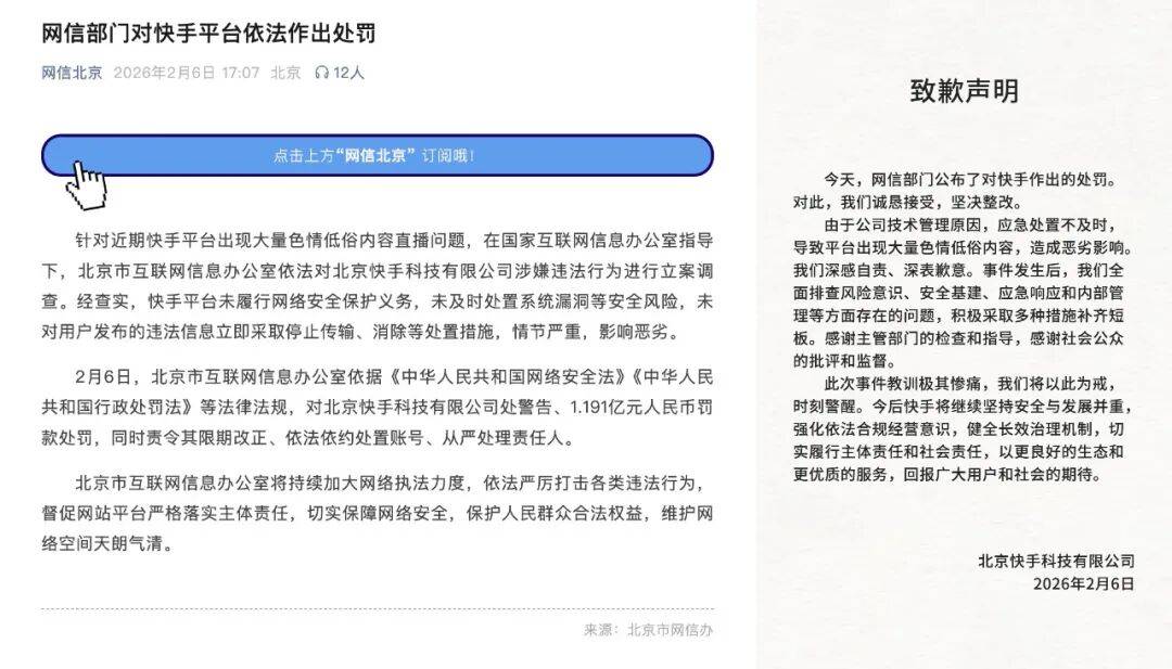 北京市互联网信息办公室依据《中华人民共和国网络安全法》《中华人民共和国行政处罚法》等法律法规,对快手作出警告并处以 1.191 亿元人民币罚款,同时责令其限期改正、依法依约处置账号,并从严处理相关责任人。